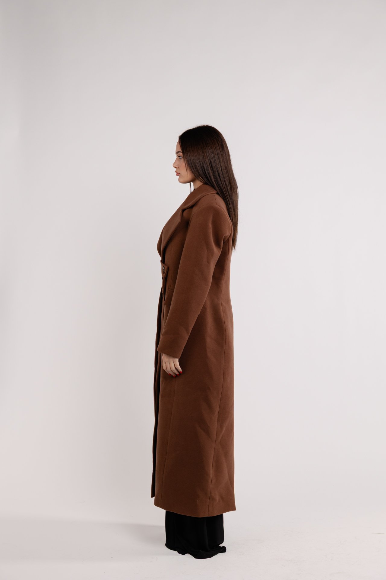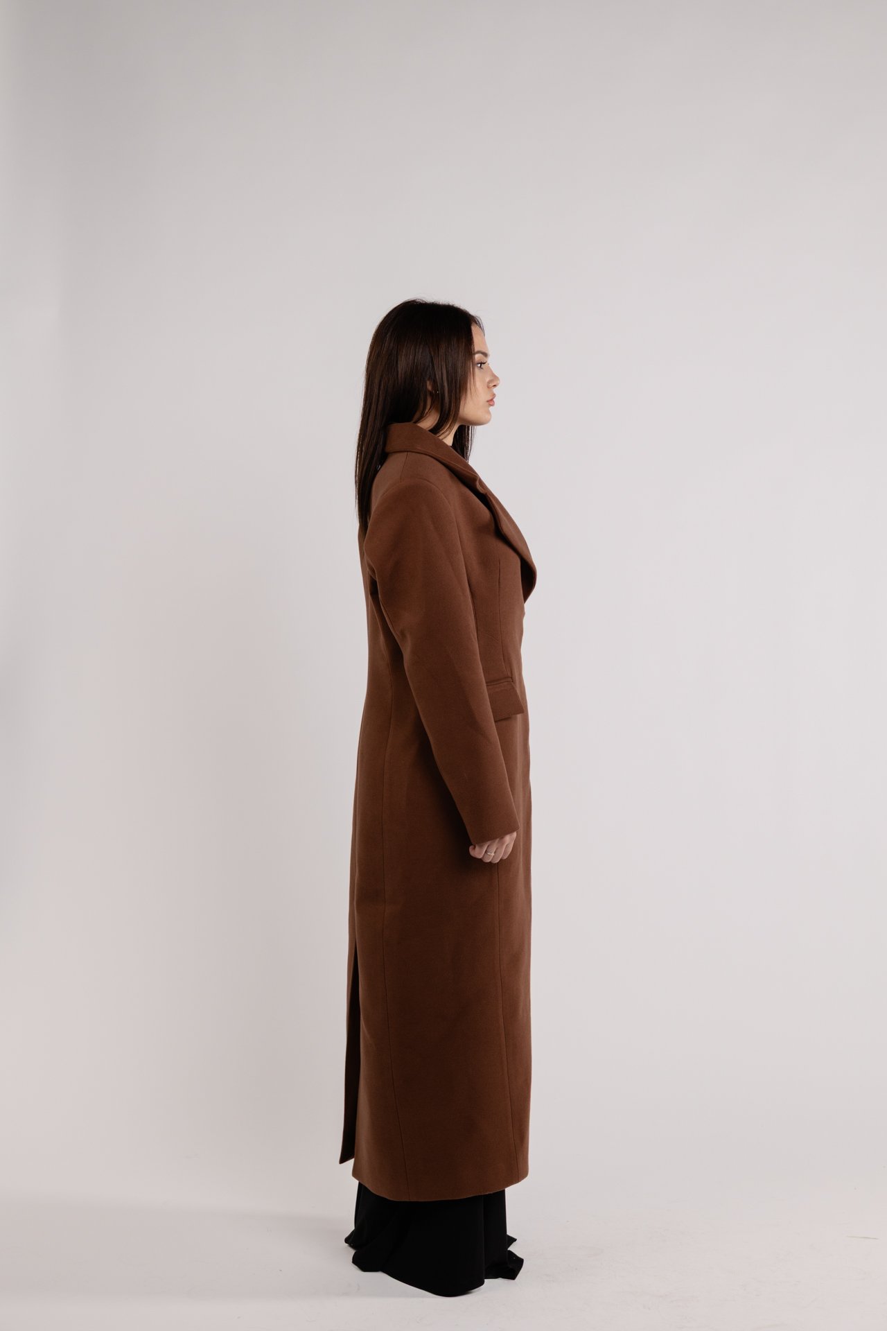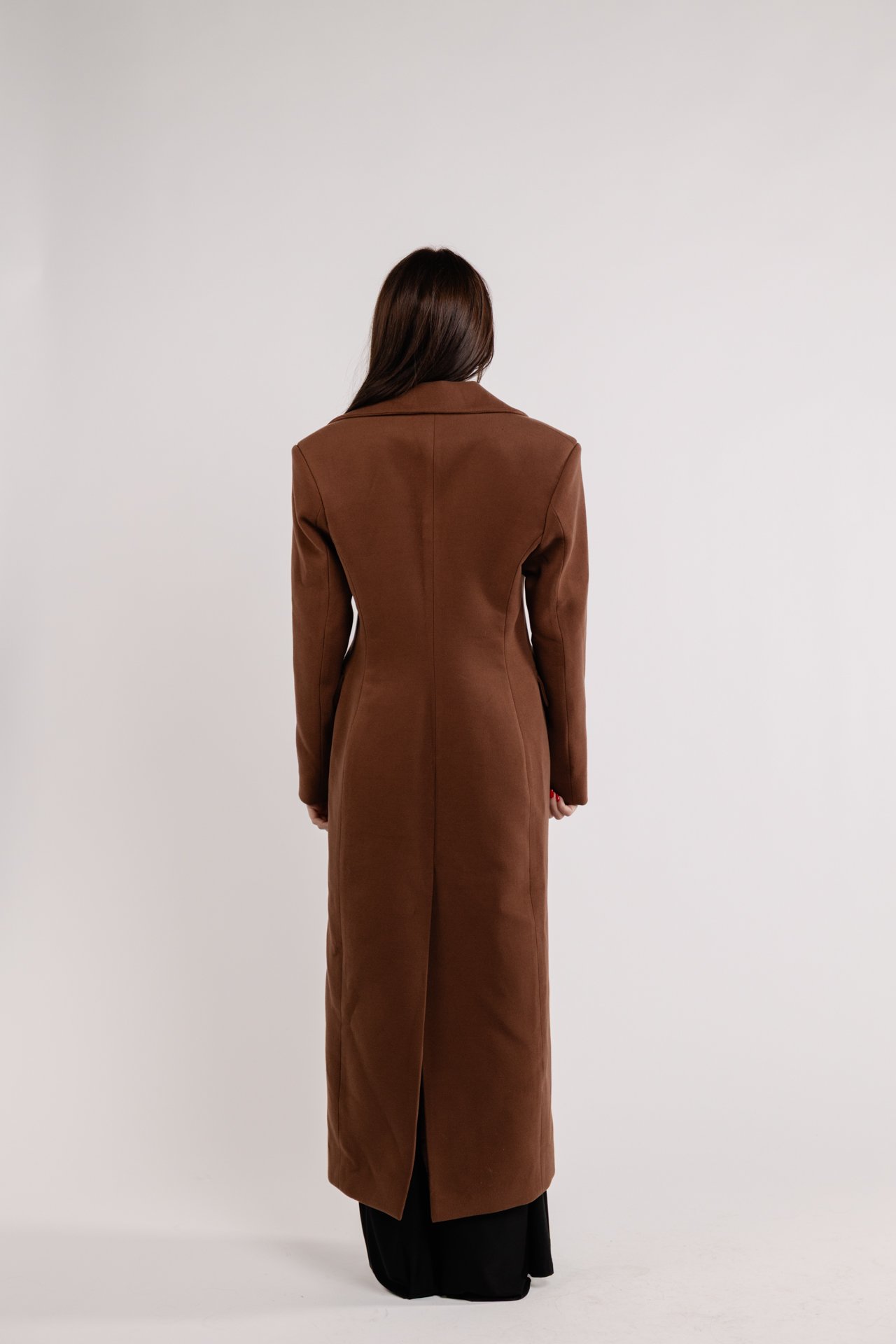 Made with durable and luxurious materials, the coat features a tailored longline silhouette that offers a flattering fit. The rich dark brown tone adds warmth to any outfit, effortlessly complementing both casual and formal attire.