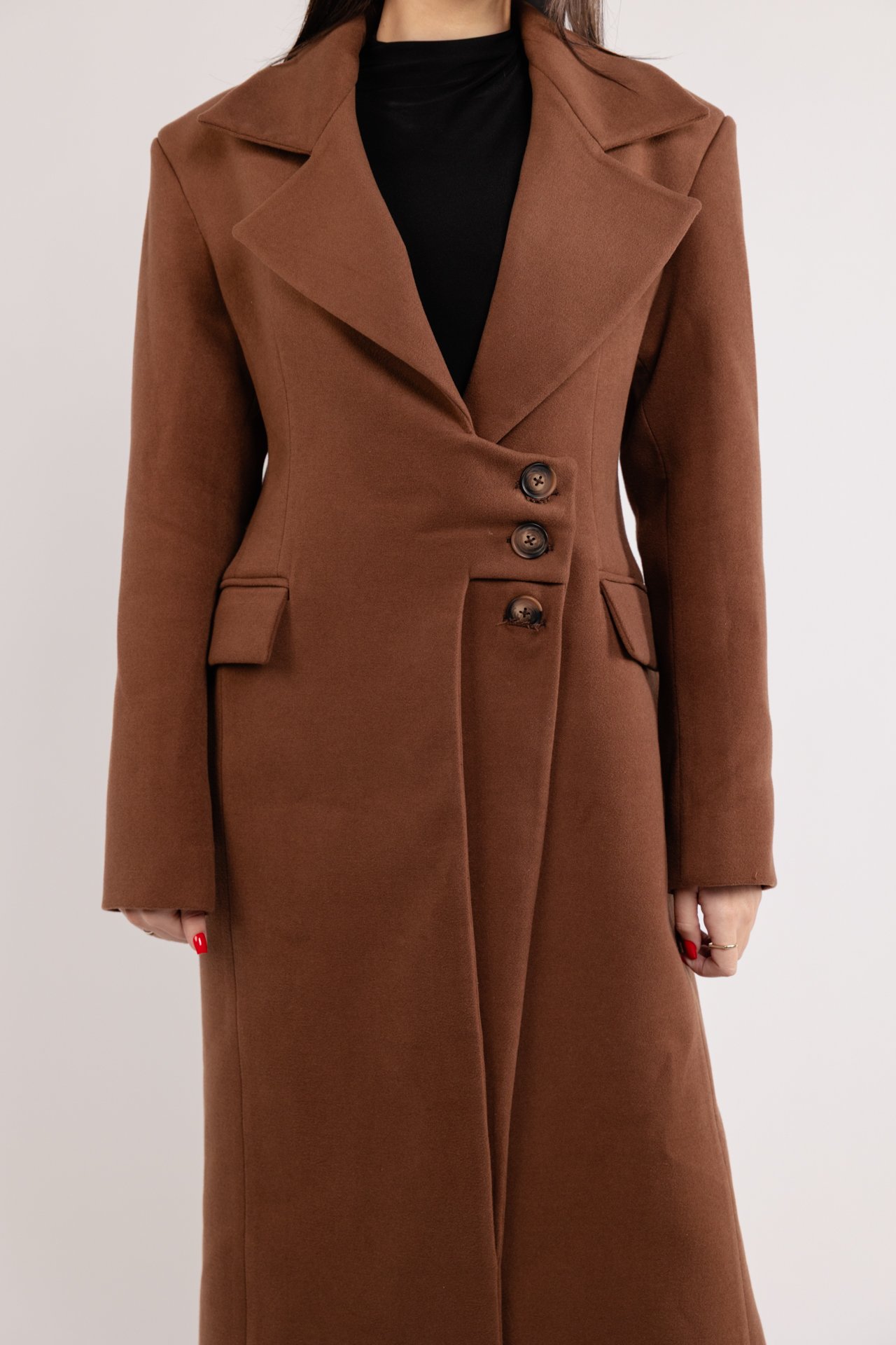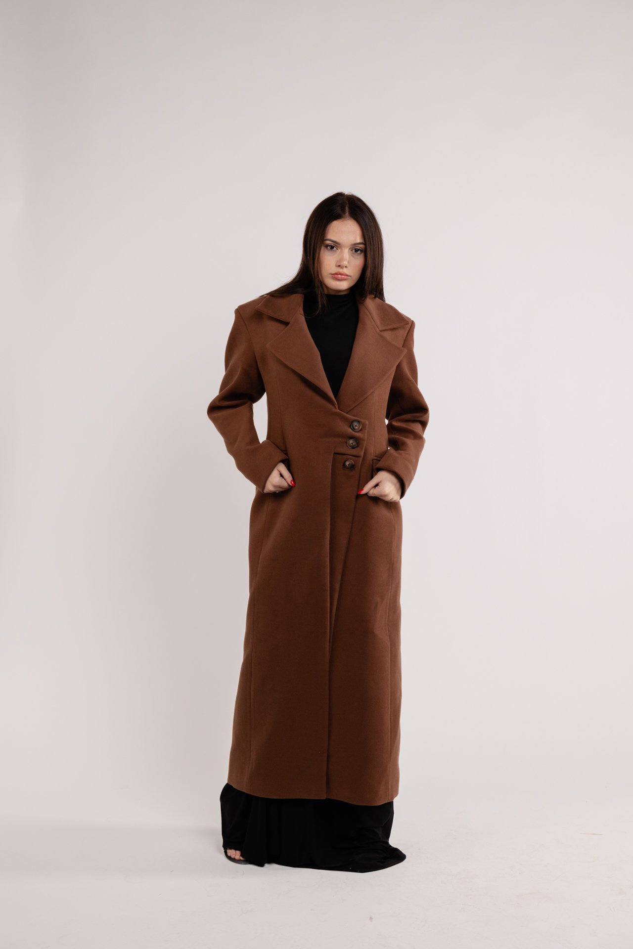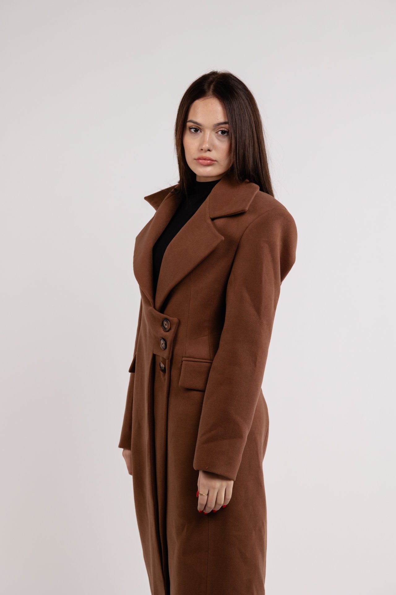 Made with durable and luxurious materials, the coat features a tailored longline silhouette that offers a flattering fit. The rich dark brown tone adds warmth to any outfit, effortlessly complementing both casual and formal attire.